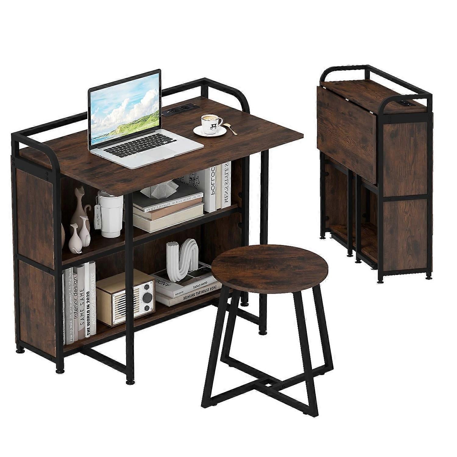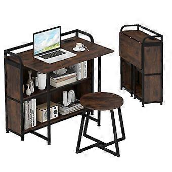 Fällbart skrivbord med eluttag, pall & hyllor, 90x55x83 cm