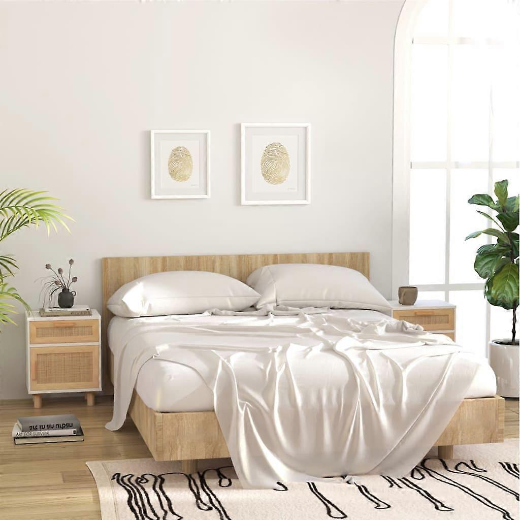 Nachttische 2 Stk. Weiß Massivholz Kiefer und Natur-Rattan