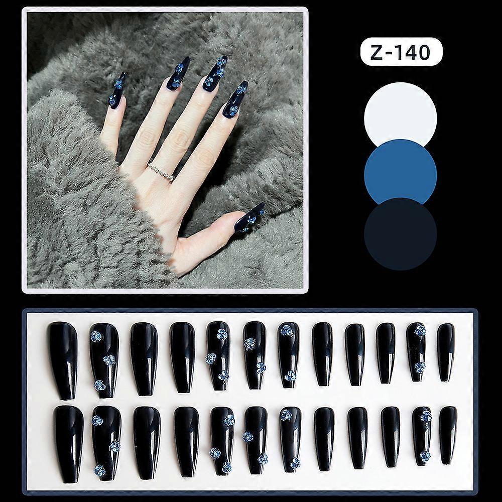 24Pcs Glossy Black False Nails Blue Hydrangea Long Fake Nails for Women and Girl