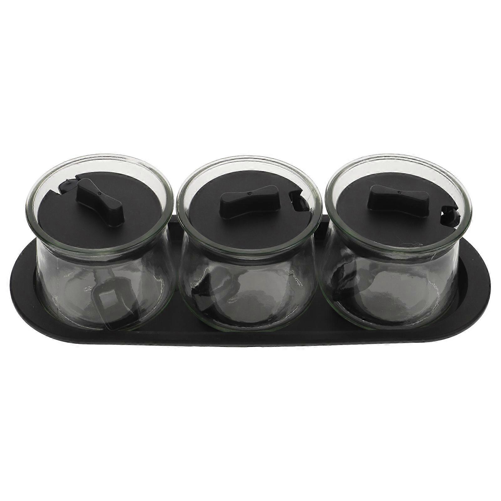 3Pcs Seasoning Condiment Jar Spice Storage Glass Bottles with Spoons and Tray