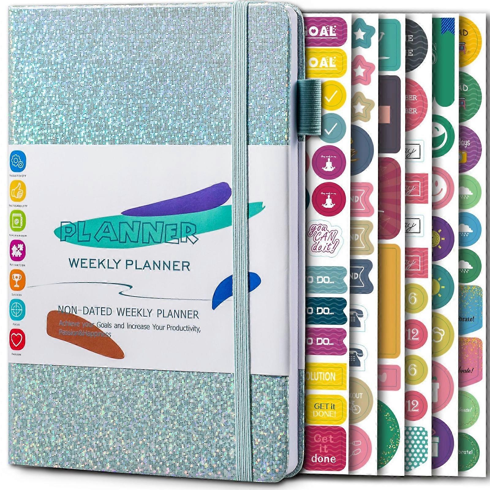 1. Smooth inner pages for effortless . 2. Comes with colorful bookmarks, combining aesthetics and practicality. 3. Equipped with a pen holder for convenience and to prevent misplacement. 4. Diverse page designs including weekly planning pages, monthly planning pages, main objectives for the week, tasks for the week, weekly dback, ha tracking, and other subsections to hp you devop good has. 5. Includes six colorful stickers. 6. Specifications: A5