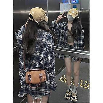 American Retro Plaid Shirt Women Spring Autumn Thin Outerwear Lazy Style Long Sleeve Tops Outerwear Loose Plaid Shirt Women