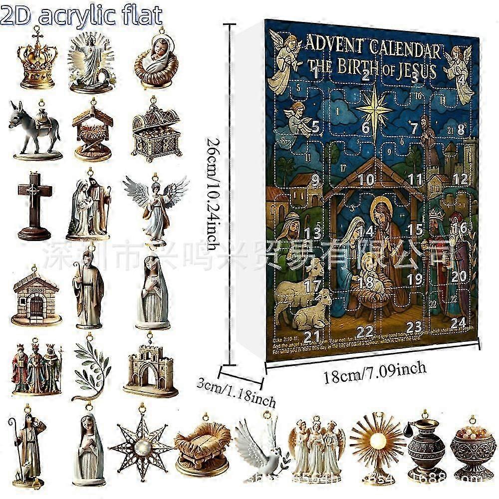 Advent Calendar The Birth of Jesus, 24 Days Countdown with 2D Acrylic Flat Ornaments, Christmas Nativity Scene Decorations, Religious Holiday Countdow