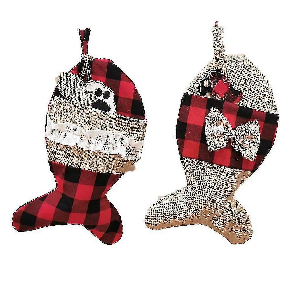 Christmas Stockings, Burlap Plaid Bone Fish Shape Pets Stockings, Christmas Decorations
