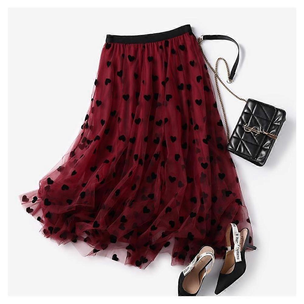 DX~~New A-line large swing skirt, flocked love polka dot half skirt, spring and autumn women's mid length slimming gauze skirt, summer mesh skirt