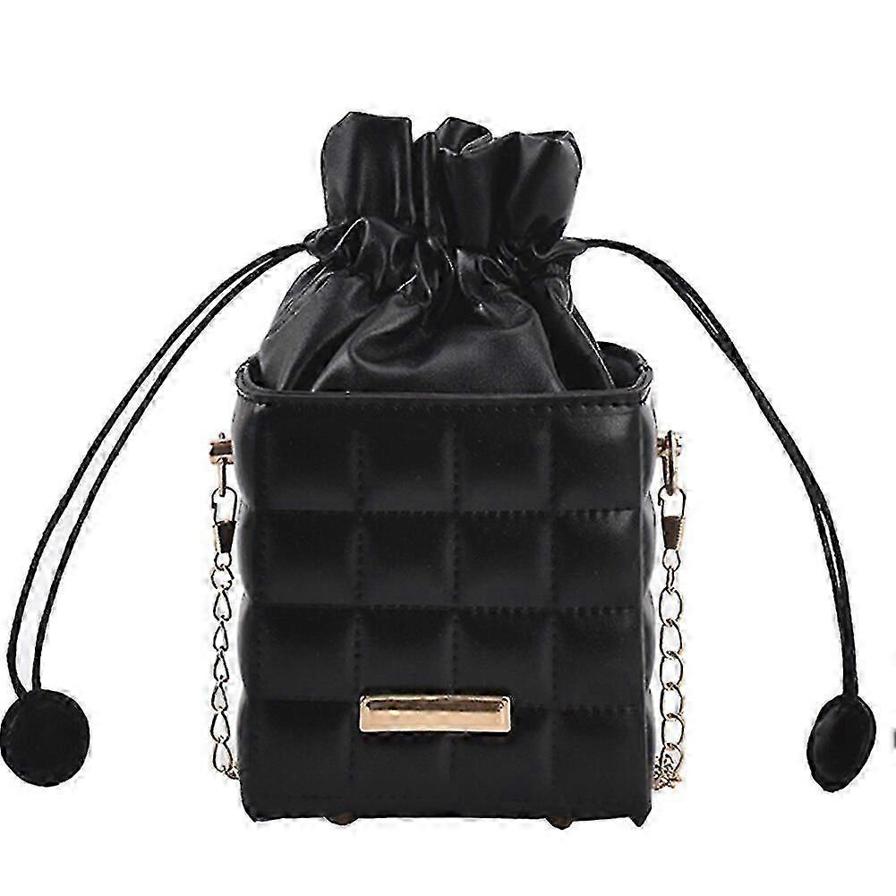 Women Pu Checker Bag Drawstring Chain Messenger Vintage Solid Color Cube Purse Fashion Cell Phone Crossbody
