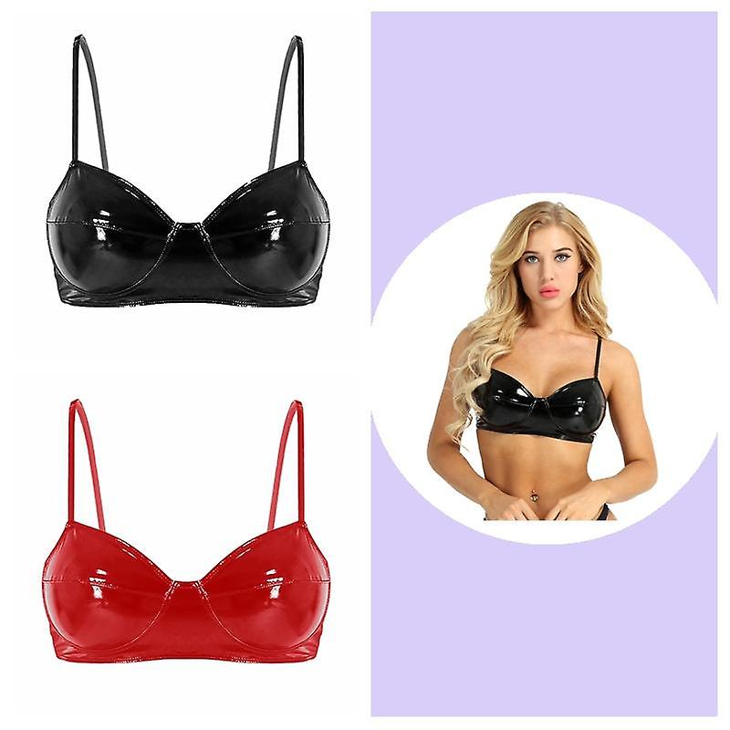 Women Wetlook Faux Leather Spaghetti Straps Wire-free No Pad Bra Top Raves Wear