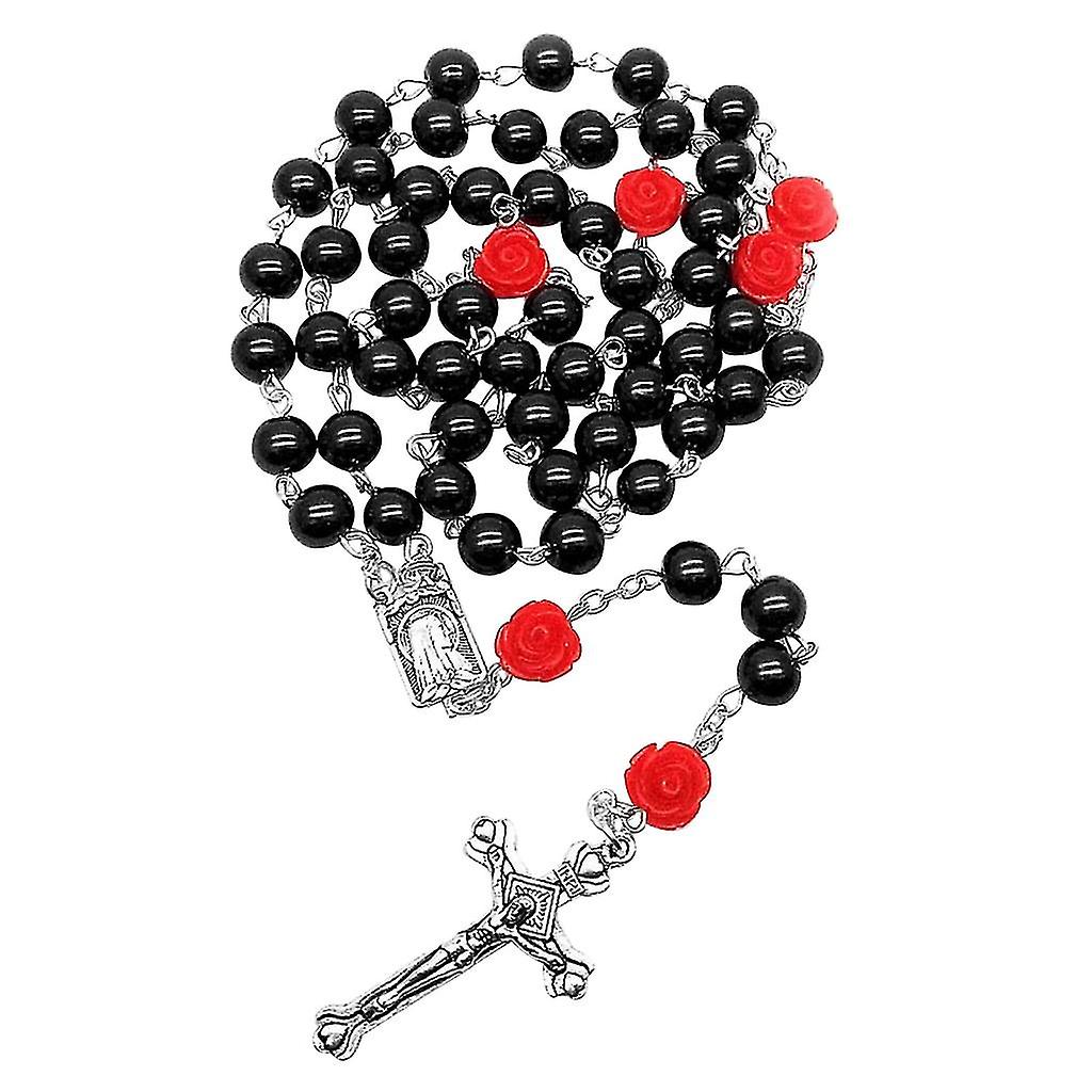 Fashion Religious Beaded Necklace Glass Cross Pendant Rose Flower Clavicle SXQ