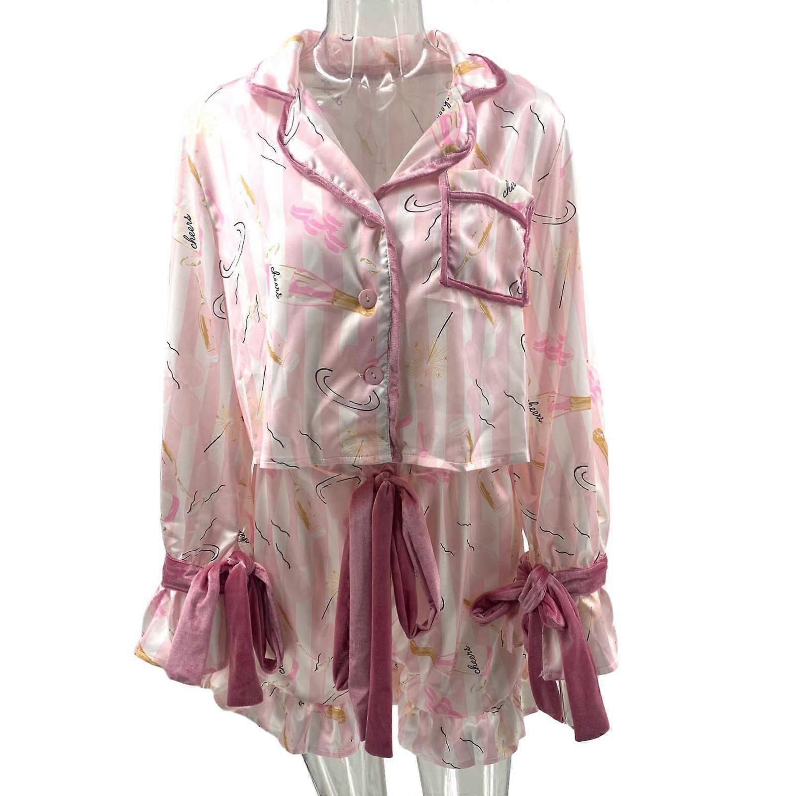 Womens Silk Satins Short Sleeve Pajamas Set Printed Buttons Down Silk Nighty Shorts Set Loungewear Sleepwear Pink XL
