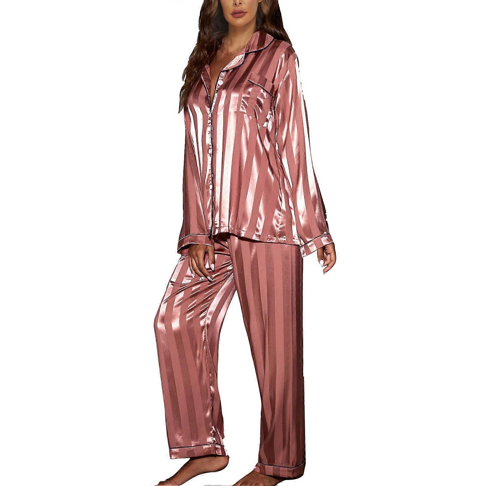 Pajama Long Sleeve Shirt Full Length Pants Striped Trim Soft Loose Button Sleepwear Set for Women
