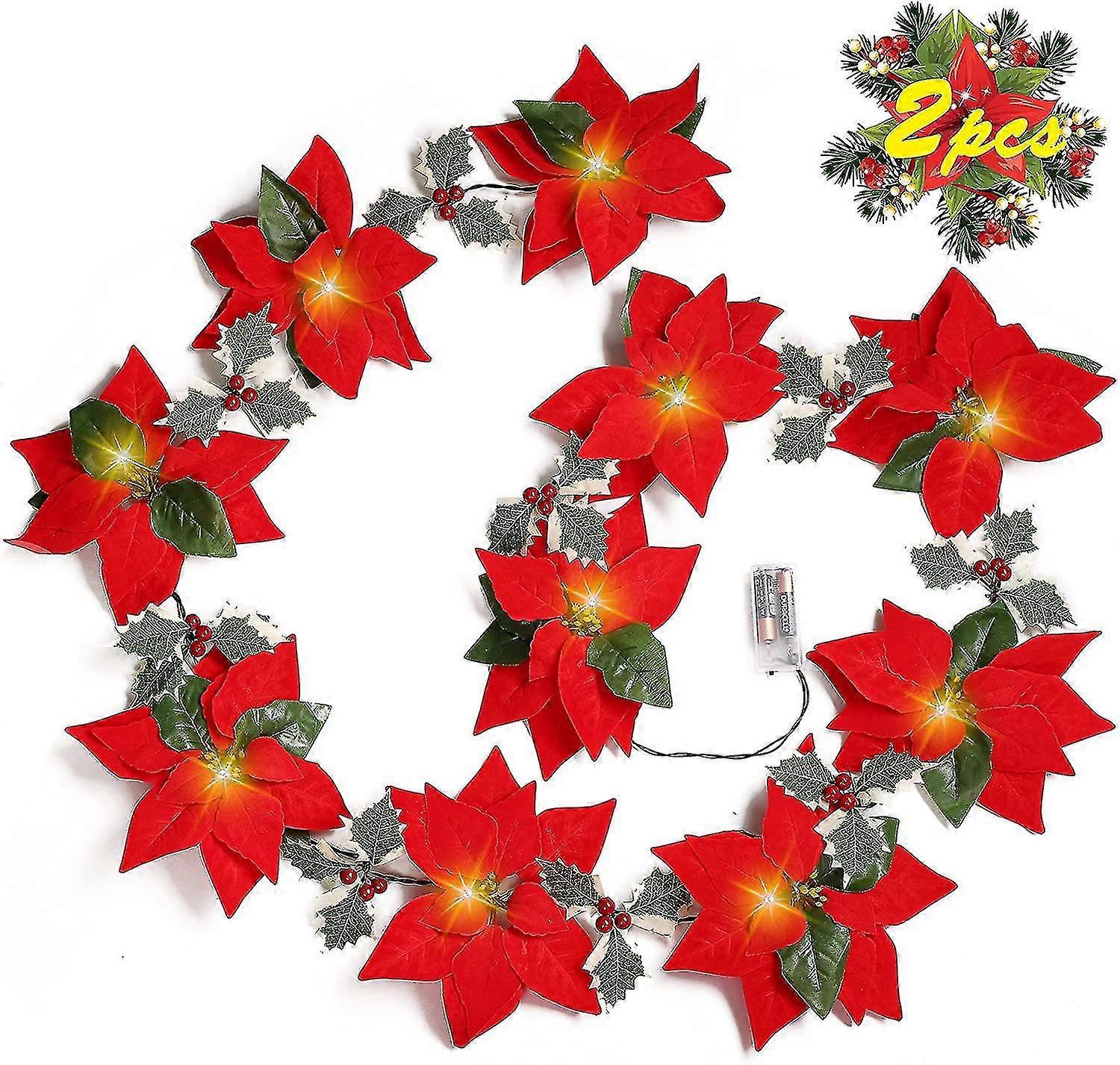 Poinsettia Christmas Flowers Decorations Garland String Lights, Xmas Tree Artificial Ornaments