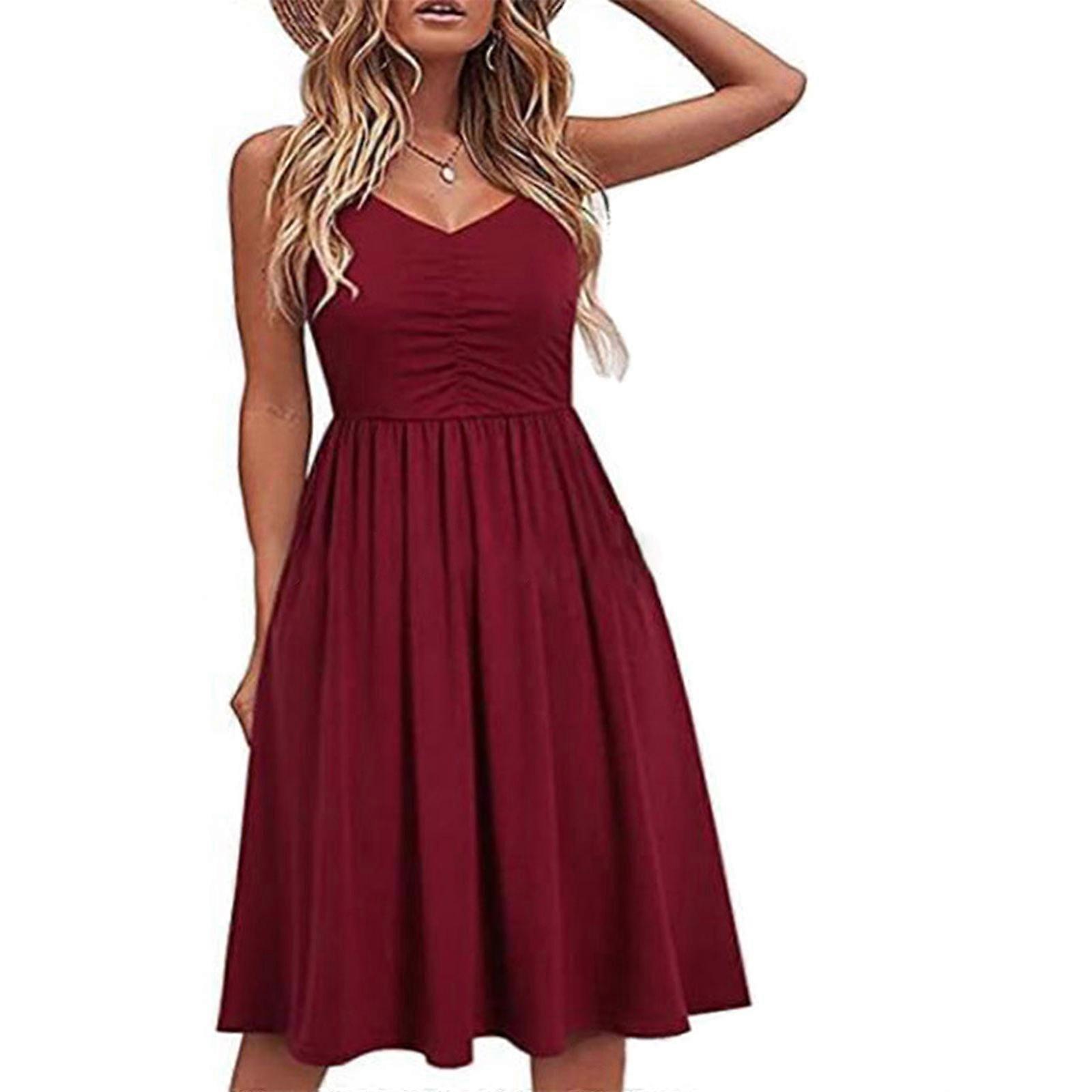 Womens Summer Dresses Casual Spaghetti Strap Swing Midi Dress with Pockets High Waist V-neck Beach-Sundress Tunic Dress Burgundy XL