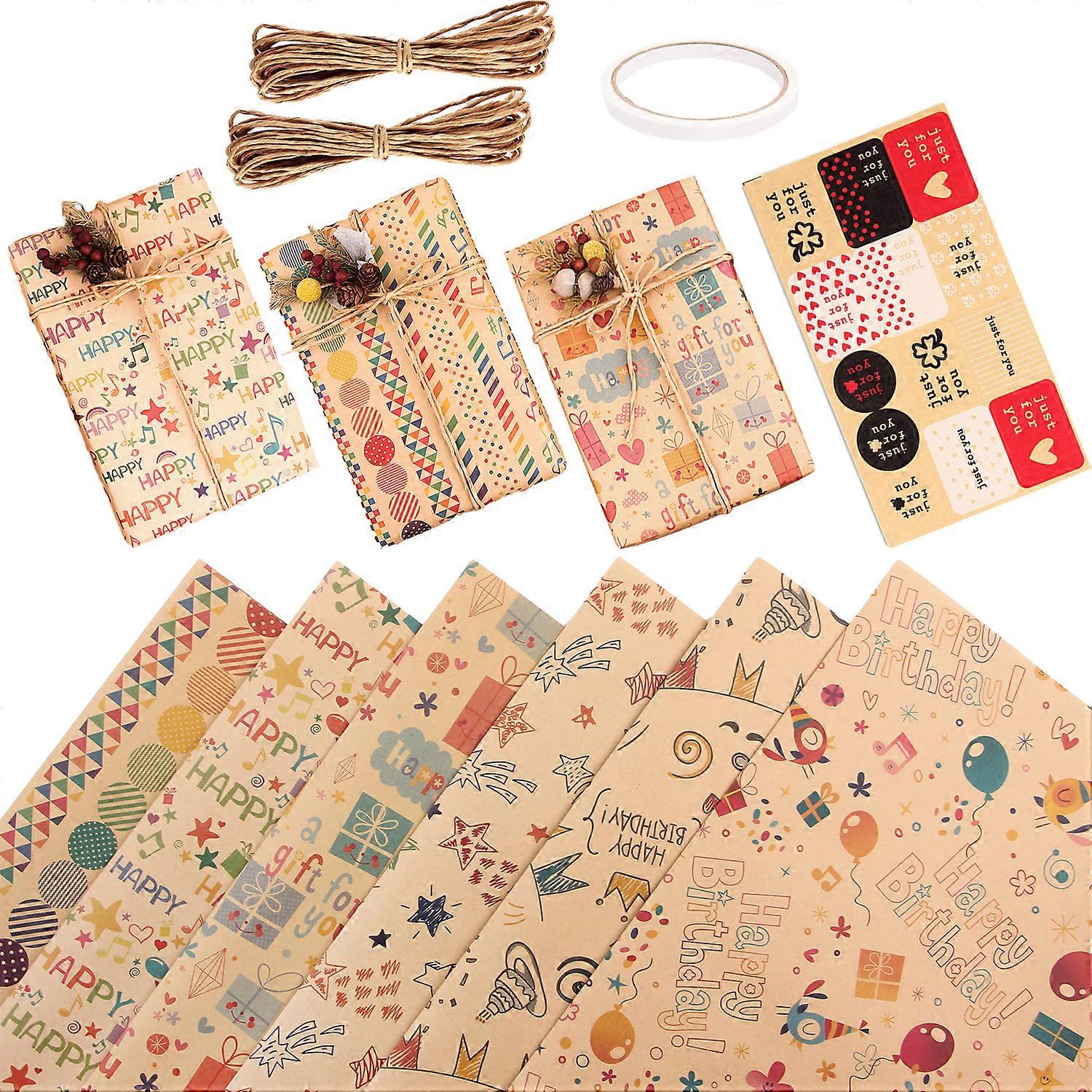 Birthday Celebration In A Package, Gift Wrapping Paper Set With Stickers And Tags, Eco Friendly Kraft Recycled For All Occasion, Multiple Designs