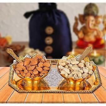 Două boluri din alamă argintie germană cu două linguri și cu o singură tavă cu cutie frumoasă de catifea